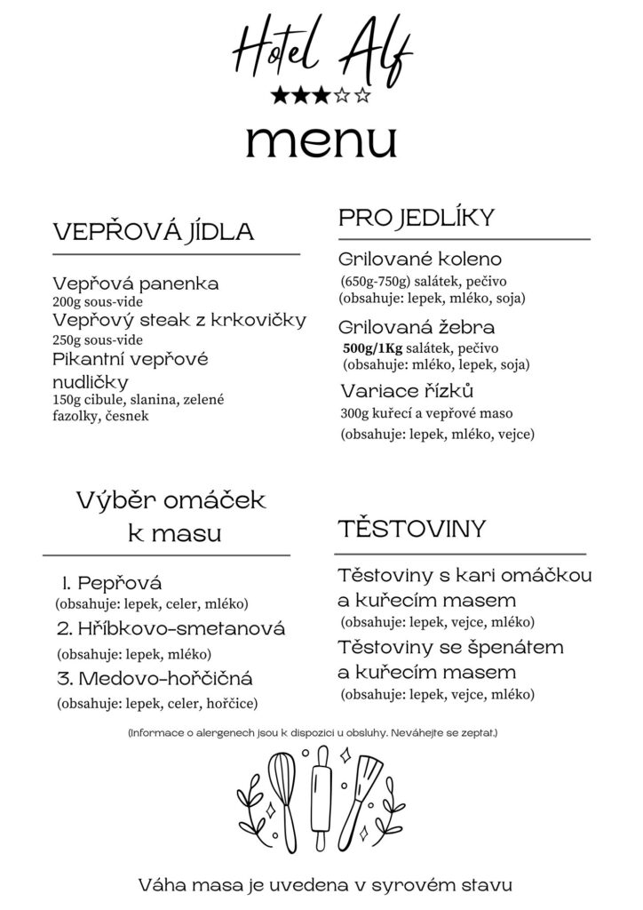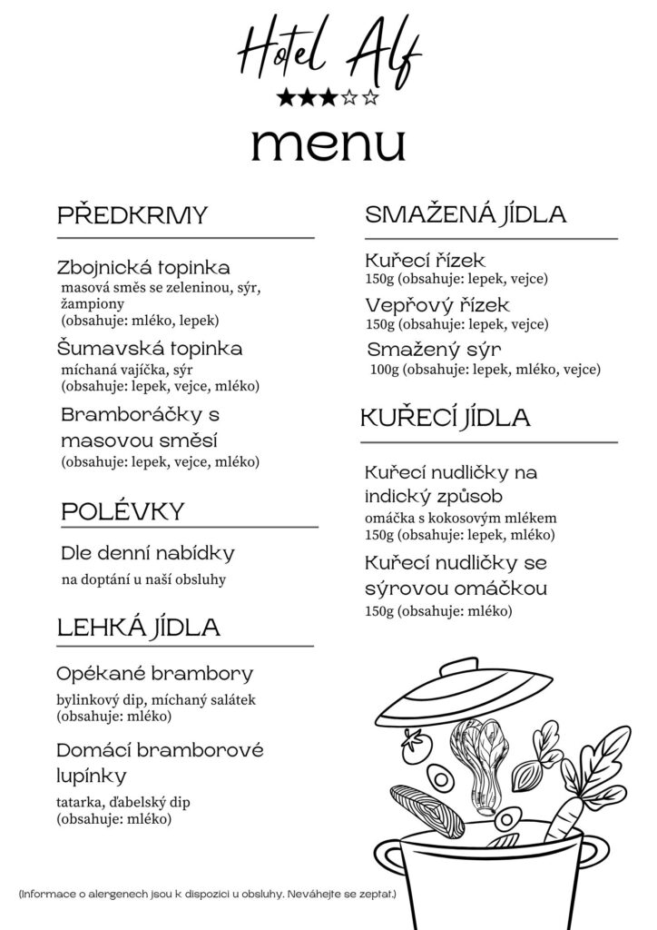 U nás vaříme poctivě, z čerstvých surovin a s důrazem na českou klasiku i lehká moderní jídla. Ať už přicházíte na rychlý oběd, rodinnou večeři nebo oslavu, vždy pro vás máme něco skvělého. Níže najdete kompletní nabídku včetně alergenů a užitečných informací.