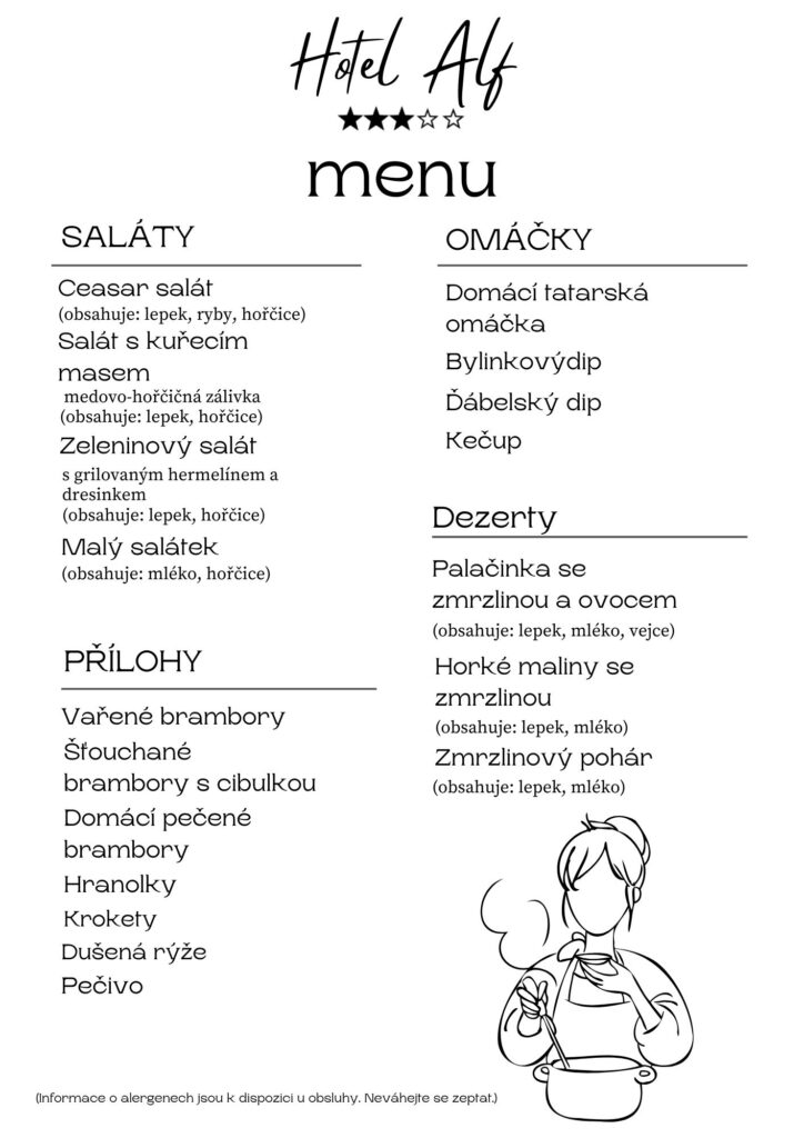 Na požádání rádi sdělíme seznam alergenů pro každé jídlo dle Nařízení (EU) 1169/2011. Přehled: 1 – Lepek, 2 – Korýši, 3 – Vejce, 4 – Ryby, 5 – Arašíd, 6 – Sója, 7 – Mléko, 8 – Ořechy, 9 – Celer, 10 – Hořčice, 11 – Sezam, 12 – Oxid siřičitý a siřičitany, 13 – Vlčí bob (lupina), 14 – Měkkýši.